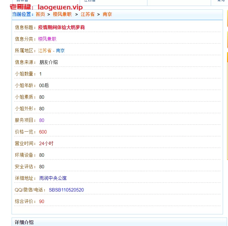 信息分类:骗子曝光 地区:江苏省-南京 信息来源:weikw 小姐数量:1 小姐年龄:00后 小姐素质:80 小姐外形:80 服务项目:80 价格:600 营业时间:24h 环境设备:80 安全评估:80 详细地址: (管理提示:经用户举报,此信息有诈骗行为,请勿被骗!) 联系方式: (管理提示:经用户举报,此信息有诈骗行为,请勿被骗!) 综合评价:90 详细介绍: 加不上 骗子曝光